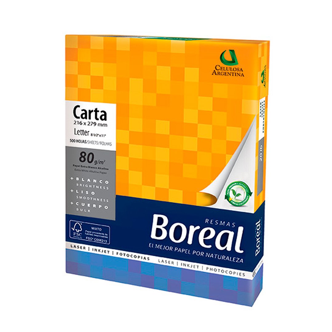 Papel extra blanco, lo que permite resaltar los textos y colores de la impresión. Las resmas Boreal se caracterizan por el excelente desempeño que exigen los equipos de última generación. Poseen mayor cuerpo y óptima lisura. Alta Opacidad, lo que permite la impresión en ambas caras. Excelente calidad lo que permite obtener óptimos resultados. Certificadas por FSC. Pueden ser utilizados para fotocopiar, imprimir en láser, imprimir en Ink Jet y para fax.
